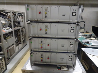 Foto: een complete EBS-set bestaande uit vier kasten. Twee voor op locatie en twee voor in de studio in Hilversum. Deze set staat in een depot van Beeld & Geluid. De dagelijkse rondleidingen bij B&G voeren onder meer langs het depot waar deze kasten te vinden zijn.