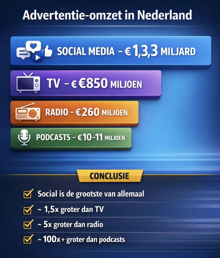 De conclusie is helder: waar podcasts vaak worden gezien als de toekomst van audio, ligt het geld voorlopig nog bij schaal. En die schaal zit — met grote afstand — bij social media, gevolgd door televisie en radio.