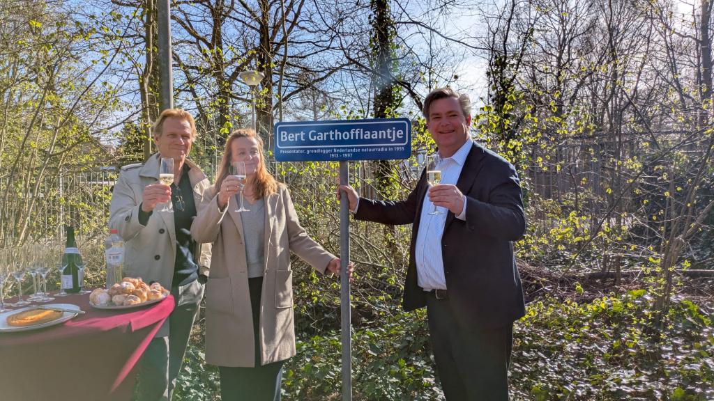 Recent vierde Vroege Vogels een bijzondere mijlpaal: 70 jaar natuur- en milieuprogramma’s op de Nederlandse radio. Ter gelegenheid van dit jubileum onthulde Vroege Vogels presentator Menno Bentveld, in aanwezigheid van de Hilversumse locoburgemeester Floris Voorink en BNNVARA Directeur Content Suzanne Kunzeler vandaag het ‘Bert Garthofflaantje’. Het laantje is onderdeel van het Jan Boon wandelpad op het Mediapark. Voorink: ‘….het is superbelangrijk dat we de pioniers van de radio, de mensen die Hilversum echt tot mediastad hebben gemaakt, blijven benoemen. Ik vind het heel belangrijk dat we die verbinding met het verleden blijven houden’.