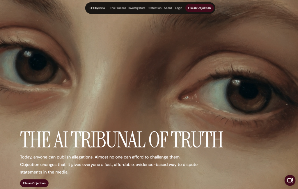 Objection.ai brengt, in eigen woorden, de huidige stand van de journalistiek en het internet samen: “Today, because of the velocity of information, the primary system through which society encounters truth is journalism. Before courts rule, before regulators act, before markets move, stories are published. Narratives form. Reputations are made or destroyed. Reality is framed — often irreversibly. And yet journalism today is not truth-adjudicated. It moves at the speed of the internet, without a shared process for testing claims.”