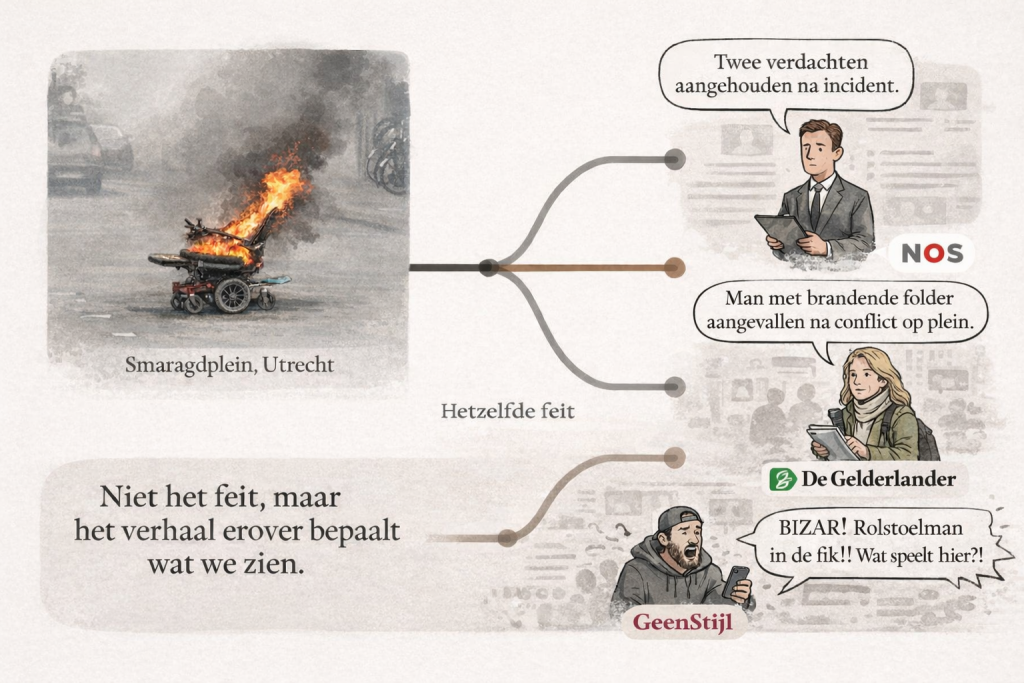 Opvallend is dat die oorspronkelijke berichtgeving uiteenloopt. Waar het landelijke medium zich beperkt tot de bevestigde feiten en het politieonderzoek, voegt de regionale bron lokale context en getuigenverklaringen toe. Tegelijkertijd laat de reactie op sociale en opinieplatforms een heel ander beeld zien: daar verschuift de aandacht van feiten naar interpretatie, speculatie en emotie. Hetzelfde incident krijgt zo in korte tijd meerdere betekenissen naast elkaar:
