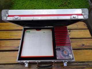 Een rode Meekelcase van TROS-radio waarin een noodband en daarnaast een stapeltje