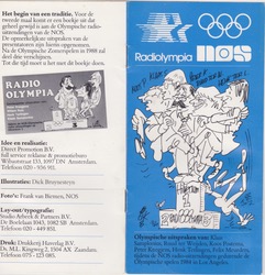 ‘Dit is RadiOlympia in annaboolstereo’. ‘Hans Eysvogel is er op mijn nachtmerrie vandoor’. ‘Als onze Olympische wintertenen weer beginnen te jeuken zijn we opnieuw in de ether’. ‘Bij zoveel medailles is het ons helaas niet mogelijk om onze nationale hymne volledig te laten uitklinken. Maar de NOS staat voor niets. Voor de liefhebbers, vanavond om twaalf uur op de andere zenders, Hilversum 2, 3 en 4 in een gezamenlijk programma het Wilhelmus in zijn geheel’. (Destijds werden er op die zenders na twaalf uur ’s nachts geen programma’s meer uitgezonden. Ergens in de Mediawet schijnt te staan dat een nationale publieke radiozender altijd met het volkslied moet afsluiten en openen. Tegenwoordig niet meer van toepassing, alle zenders worden 24/7 van audio voorzien, dus hoeft er geen Wilhelmus meer gedraaid te worden. Jan Slagter heeft nog een exemplaar van de Mediawet op zijn nachtkastje liggen. Vandaar dat er op NPO Radio 5 van maan- t/m zaterdag ’s morgens na het NOS-journaal van 6 uur (een 2 minuten bulletin, gelezen vanuit nieuwscel 1) begonnen wordt met het Wilhelmus. Niet op zondagochtend, dan heeft Jan geen zendtijd). Binnenin het boekje staat een aantal kleine zwart-wit foto’s. Met het vergrootglas in de hand herkennen we, behalve alle zes de presentatoren, Hans Hogendoorn (‘de stem van RadiOlympia’), Ferry de Groot, Herman van der Velden, Jenny Jalvink, Simone Wijnschenk, Peter Onvlee, Hans van der Sluis en Kees Buurman. En op diverse andere foto’s onder meer de technici: Theo Prinsen, Ewoud Smit, Leen Schaap, Martin Schuurmans, Wim de Feiter, Paul Swart, Gert Ooms en Aard Zwaal.