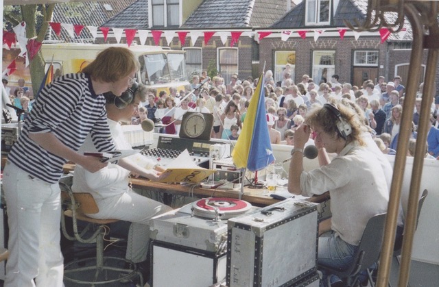 Foto 1: (© Beeld & Geluid) 18 juni 1982, Frits Spits aan boord van de Princehof tijdens ‘Varen & fietsen ’82’ achter de Iemke Roos dj-set. De man gestreept shirt is producer Tom Blomberg.