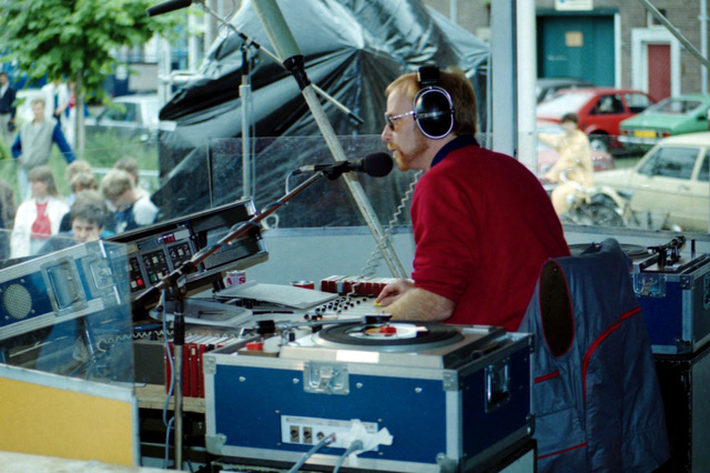 Foto 3: (© Gert de Bruijn) 19 juli 1984, Ferry Maat presenteert de TROS Top 50 in Nijmegen tijdens de Vierdaagse. Voor de detailtijgers: het netsnoer van de draaitafel, een Technics SP10, is met wit plakband vastgezet. Isser vast al een keer uitgevallen.