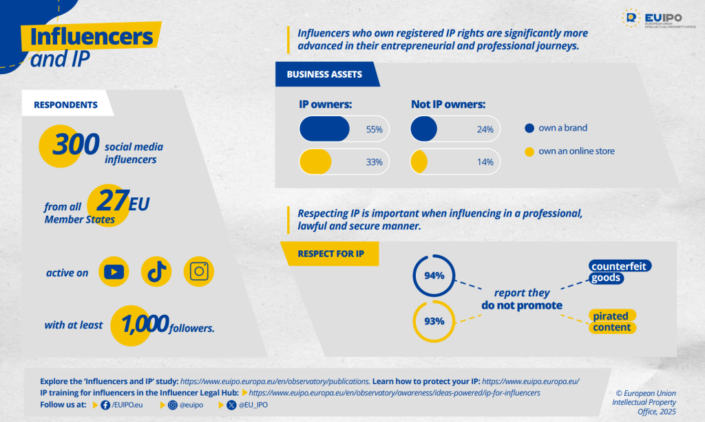 Opvallend is dat het vak van influencer snel professionaliseert: 92% verdient inmiddels geld met contentcreatie, maar slechts 18% bezit eigen intellectuele eigendomsrechten, zoals handelsmerken of ontwerpen. Influencers die wél IP registreren, blijken verder in hun zakelijke ontwikkeling te zijn: meer dan de helft heeft een eigen merk en een derde runt een webshop.