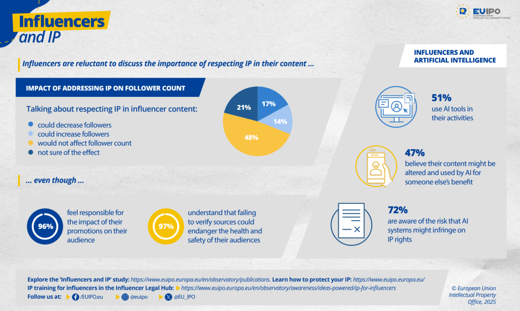 Influencers in de EU zijn zich steeds bewuster van de risico’s rond het promoten van namaakproducten en illegale digitale content. Dat blijkt uit Influencers and IP, een nieuw onderzoek van het European Union Intellectual Property Office (EUIPO), het eerste dat de relatie tussen influencers en intellectueel eigendom in kaart brengt.