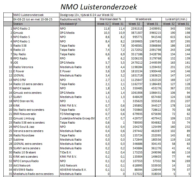 De zomervakantie zorgt opnieuw voor verschuivingen in de luistercijfers. NPO Radio 2 blijft dankzij een hogere luistertijd de grootste en vergroot de voorsprong op Qmusic, dat opnieuw marktaandeel verliest maar met ruim 3,8 miljoen luisteraars wel bereikleider blijft. NPO Radio 5, NPO Radio 1 en Radio 538 winnen licht, net als Radio 10, Joe en 100% NL. NPO 3FM zet een stevige plus neer, terwijl Veronica terrein verliest. Dat blijkt uit de NMO-cijfers over week 32.