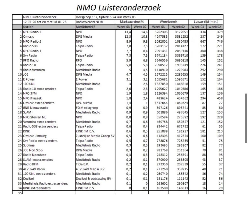 NPO Radio 2 was in week 3 van 2026 opnieuw de best beluisterde zender van Nederland met een marktaandeel van 13,4%, blijkt uit de nieuwste cijfers van het NMO Luisteronderzoek. Qmusic volgt op korte afstand met 12,3% en blijft dankzij onder meer Het Verboden Woord sterk presteren, terwijl het weekbereik weer boven de 4 miljoen luisteraars uitkomt. NPO Radio 5 staat derde met 8,9%. Radio 538 wint terrein en ziet het bereik herstellen, terwijl Sky Radio, Radio 10 en Veronica stabiel blijven. Joe zet de opgaande lijn voort.