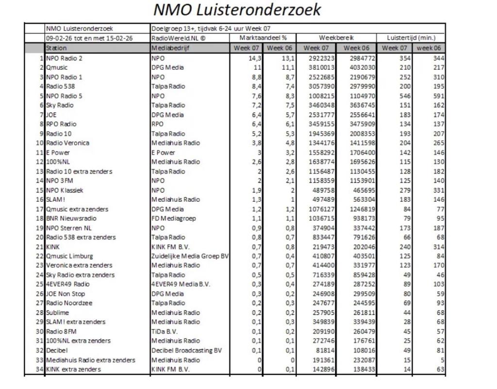 NPO Radio 2 vergroot het marktaandeel dankzij de Top 80s. De groei komt vooral door een langere gemiddelde luistertijd. Qmusic blijft de zender met het grootste bereik, maar zakt met het weekbereik onder de grens van 4 miljoen luisteraars.