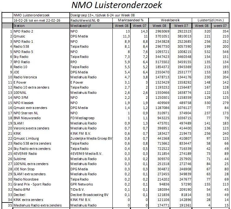 NPO Radio 2 was in week 8 van 2026 de best beluisterde zender van Nederland met een marktaandeel van 13,0%, blijkt uit de nieuwste cijfers van het NMO Luisteronderzoek. Qmusic volgt met 11,3% en NPO Radio 1 staat derde met 8,9%.