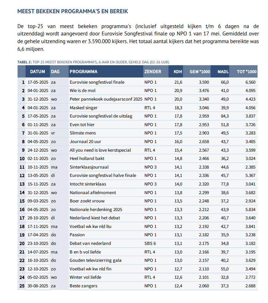 Grote live-evenementen blijven onverminderd populair. De best bekeken uitzending van 2025 was de finale van het Eurovisie Songfestival op 17 mei op NPO 1. Gemiddeld keken 3,59 miljoen mensen, terwijl het totale bereik opliep tot maar liefst 6,6 miljoen kijkers. Daarmee was het Songfestival niet alleen het meest bekeken programma, maar ook het programma met de meeste uitgestelde kijkers Jaarpersbericht_2025.