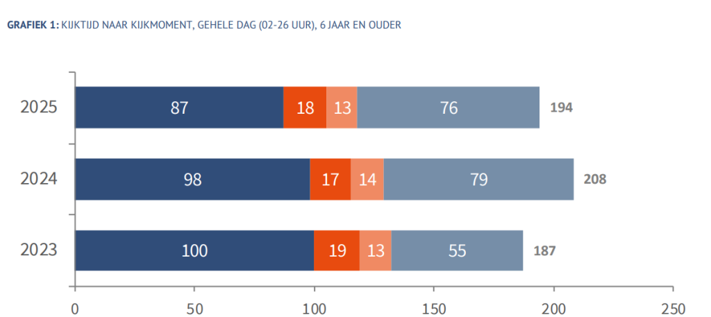 De tijd die Nederlanders dagelijks voor de televisie doorbrengen, is in 2025 opnieuw afgenomen. Dat blijkt uit het jaarpersbericht van Nationaal Media Onderzoek (NMO). Gemiddeld werd er vorig jaar 194 minuten per dag naar het televisiescherm gekeken, inclusief ander schermgebruik zoals video-on-demand. De daadwerkelijke kijktijd naar televisiezenders kwam uit op 118 minuten per dag, tegen 129 minuten in 2024 en 132 minuten in 2023 Jaarpersbericht_2025.