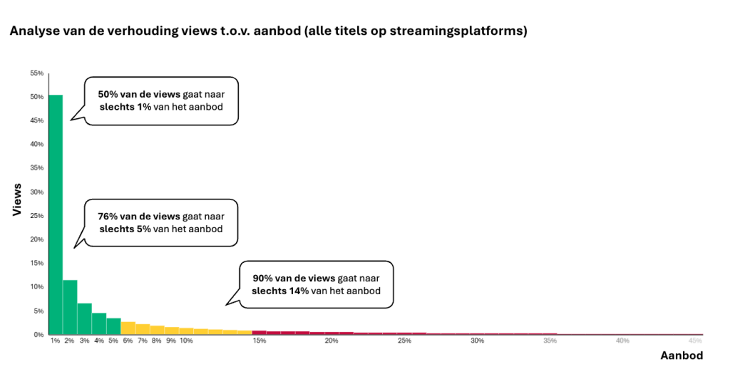 De analyse onder 140.000 kijkprofielen toont een scheve verdeling: 76% van de kijktijd is voor 5% van het aanbod, en 90% van alle views voor slechts 14%.