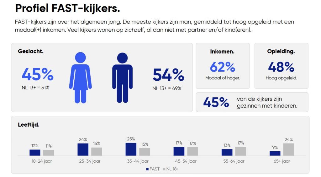 Het onderzoek laat zien dat FAST-kijkers een duidelijk profiel hebben. Het gaat relatief vaak om jongere kijkers die hoger zijn opgeleid en een modaal of hoger inkomen hebben. Daarnaast zijn het doorgaans lichte tv-kijkers, die minder traditioneel lineair televisiekijken maar wel regelmatig gebruikmaken van Connected TV.