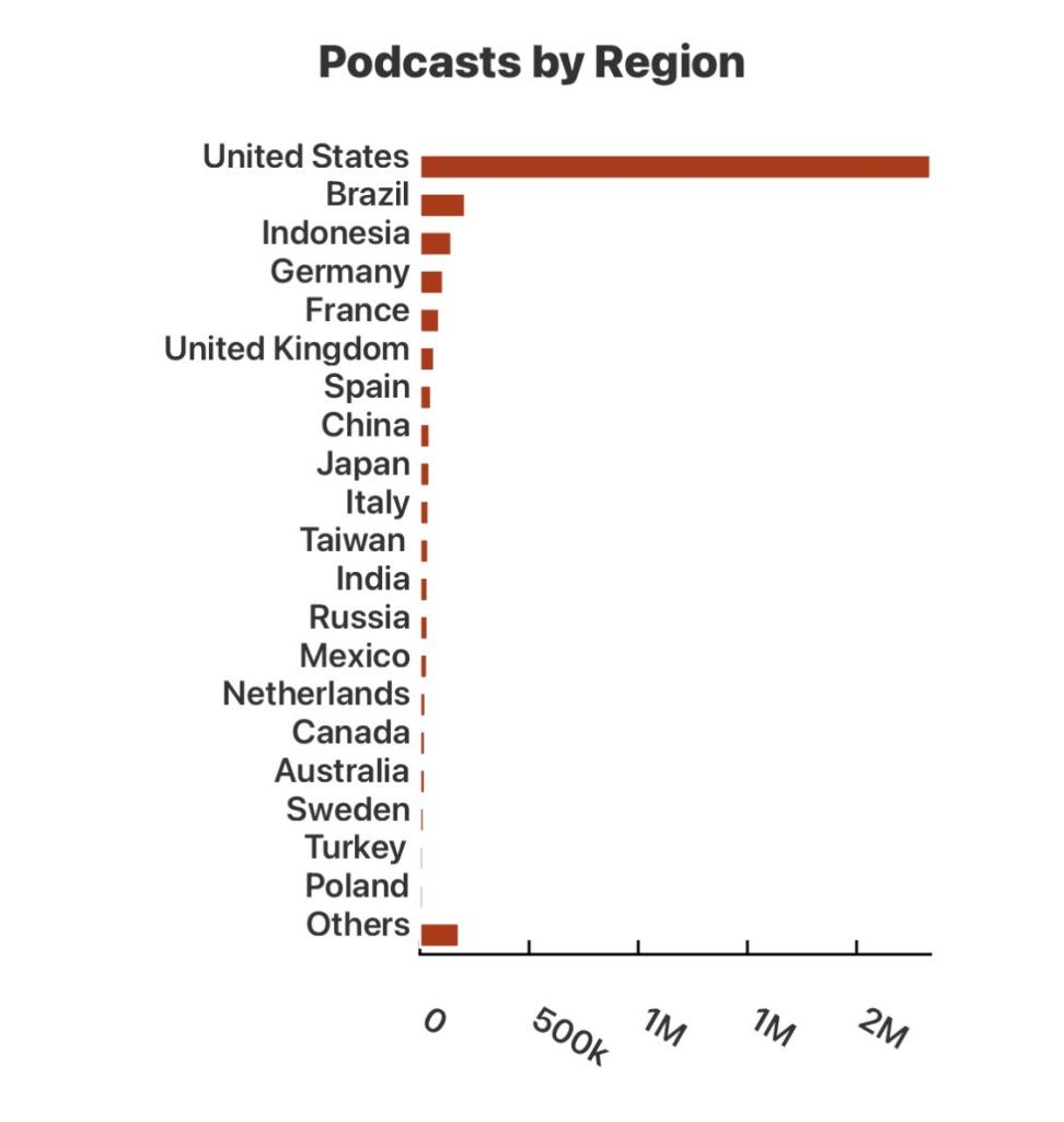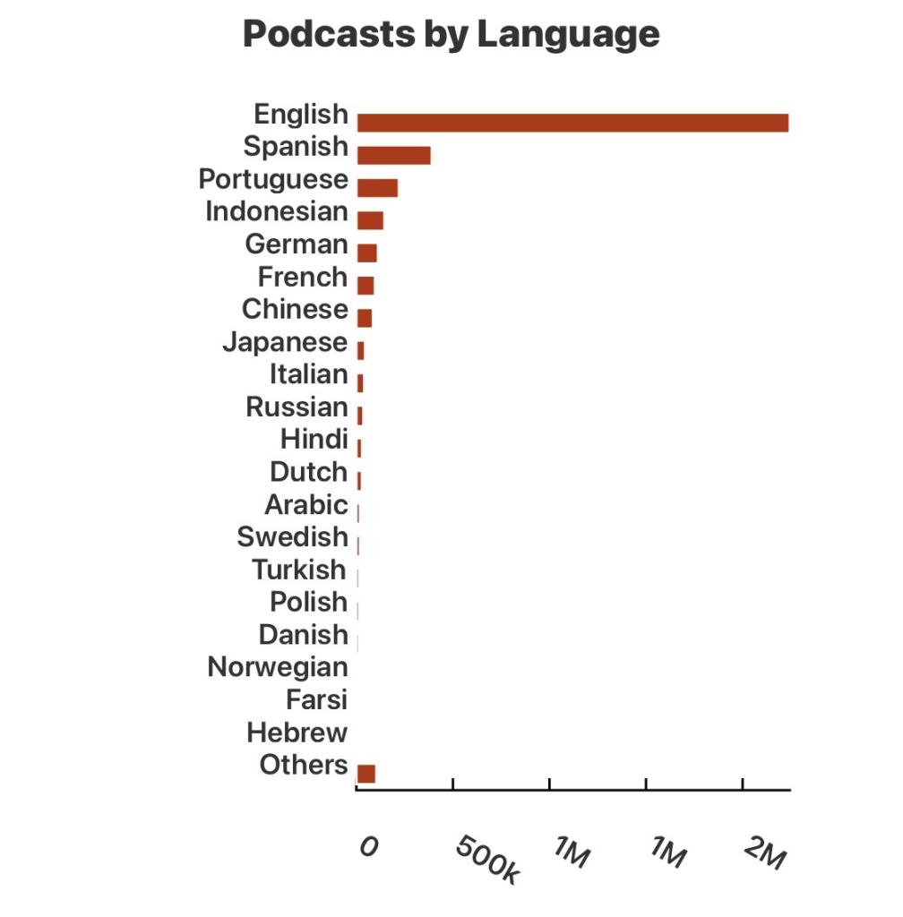 De meeste podcasts zijn Engelstalig en afkomstig uit de Verenigde Staten. Nederland behoort wereldwijd tot de subtop als herkomstland. Ter vergelijking: IMDb telt meer dan 22 miljoen titels, Spotify ruim 100 miljoen tracks en Audible meer dan 470.000 audioboeken.