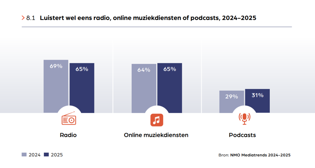 Opvallend is dat radio en online muziekdiensten inmiddels even groot zijn: beide bereiken 65% van de Nederlanders. Daarmee komt streaming voor het eerst op gelijke hoogte met traditioneel radiogebruik. Spotify blijft daarbij de grootste speler binnen muziekstreaming.