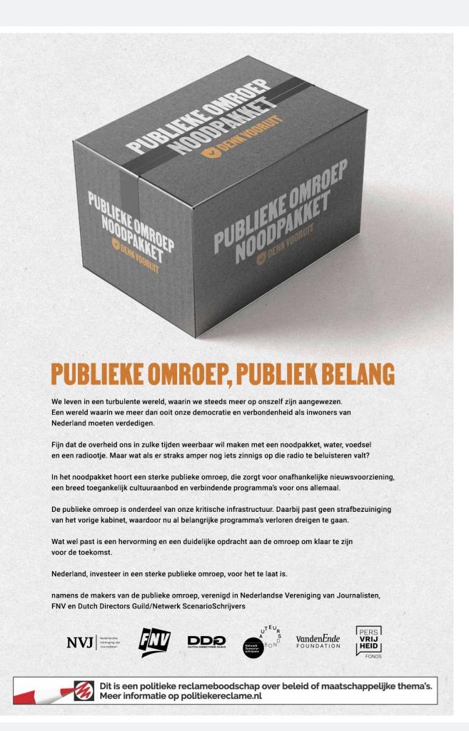 In diverse landelijke dagbladen is een paginagrote advertentie verschenen over de rol en toekomst van de publieke omroep. In de advertentie wordt aandacht gevraagd voor het belang van een sterke publieke omroep als onderdeel van de democratische infrastructuur. De oproep is ondertekend door onder meer de Nederlandse Vereniging van Journalisten (NVJ), FNV, de Dutch Directors Guild, het Netwerk Scenarioschrijvers en de VandenEnde Foundation. Vandaag vindt in Den Haag het mediadebat plaats.