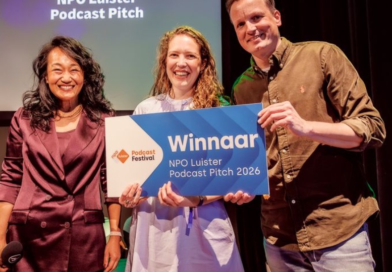 V.l.n.r. radio- en podcastmaker Mischa Blok, winnaar NPO Luister Podcast Pitch 2026 Dieuwertje van Muyden en juryvoorzitter Herbert Codée. Fotocredits: NPO Luister/Ben Houdijk.