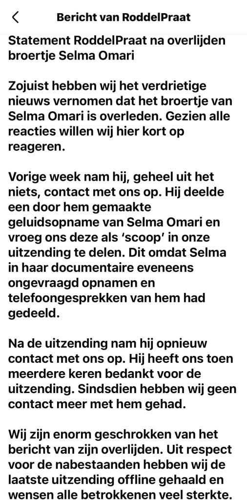 Roddelpraat heeft hun meest recente aflevering verwijderd na het overlijden van de broer van Selma Omari. In de uitzending werd een gelekt telefoongesprek besproken, wat veel kritiek opleverde. Presentatoren Dennis Schouten en Jan Roos zeggen dat de broer zelf contact met hen had opgenomen, maar dat de aflevering uit respect voor de nabestaanden nu offline is gehaald.