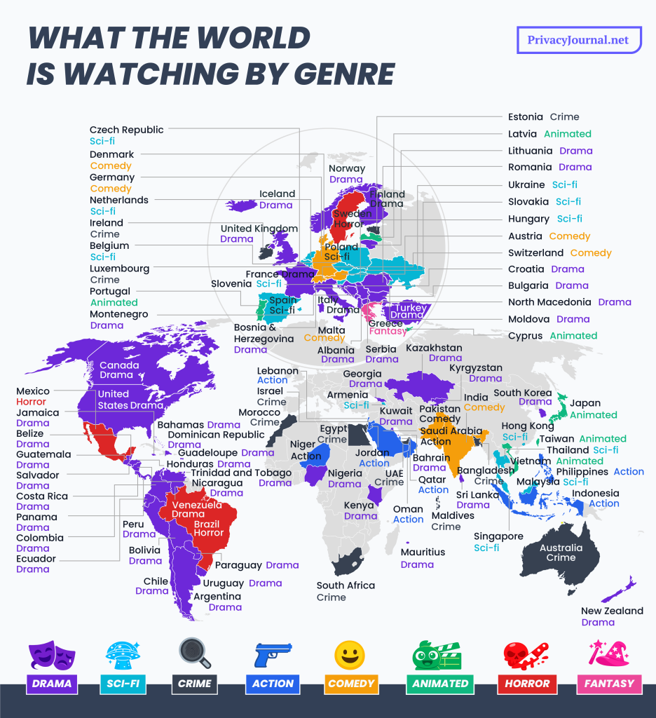 Uit aanvullend onderzoek van PrivacyJournal.net, gebaseerd op data van FlixPatrol, blijkt dat kijkgedrag wereldwijd duidelijke patronen laat zien. Drama is in 51 landen het populairste genre, gevolgd door sci-fi en misdaad. Content van Netflix domineert in 58 landen, terwijl Noord-Amerikaanse producties in 76 landen het meest bekeken zijn.