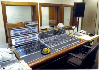 Studio 1 met een solide Studertafel en links daarnaast de blauwgekleurde Oscar. Geheel rechts een plafondhoge grijze kast. Daarin woonde alle elektronica van Oscar.