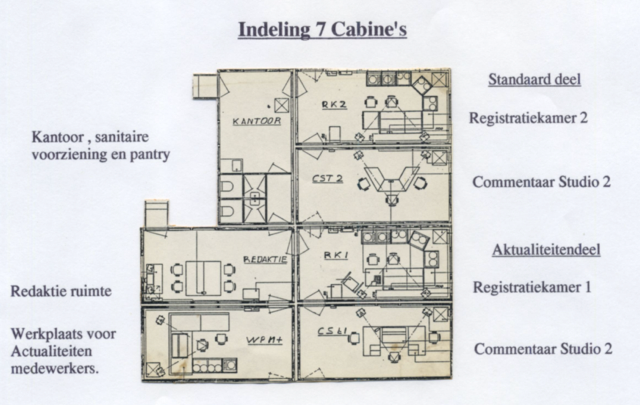 In de jaren ’80 werd er uitgebreid nagedacht over verplaatsbare studio’s i.v.m. de noodzakelijke vernieuwing van alle radiostudio’s in Hilversum. De oude analoge NOS-regeltafels waren aan vervanging toe en ‘digitaal’ was inmiddels meer dan een toverwoord. De studio’s waren te vinden in de panden van de AVRO, NCRV, KRO, VARA, VPRO en Muziekpaviljoen. Het idee was om in betreffend omroepgebouw alle studio’s in één keer onder handen te nemen. Buiten zouden dan zeven verplaatsbare containers geplaatst worden met daarin ondergebracht twee complete studio’s, een kantoor, redactieruimte en een WPM (zie foto 1). In een periode van een half jaar kon een compleet omroeppand radiotechnisch vernieuwd worden, de zeven containers weer op een vrachtwagen geladen, op naar het volgende pand. En zo zou heel radio Hilversum vernieuwd worden.