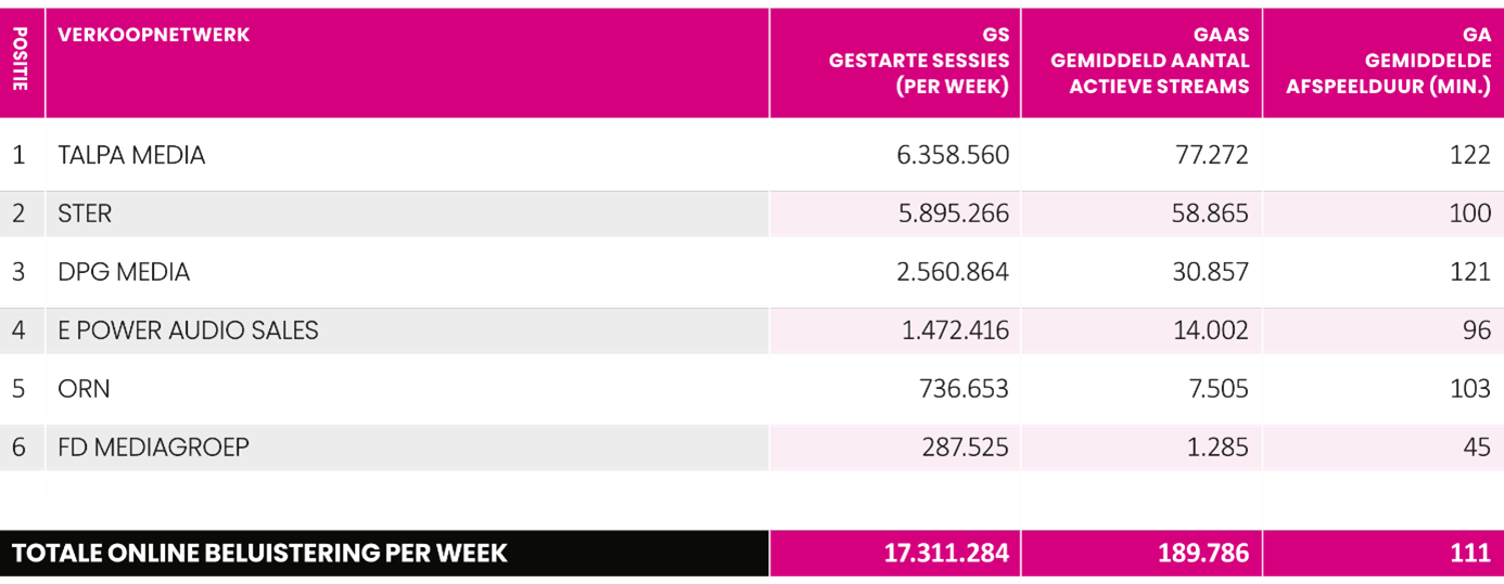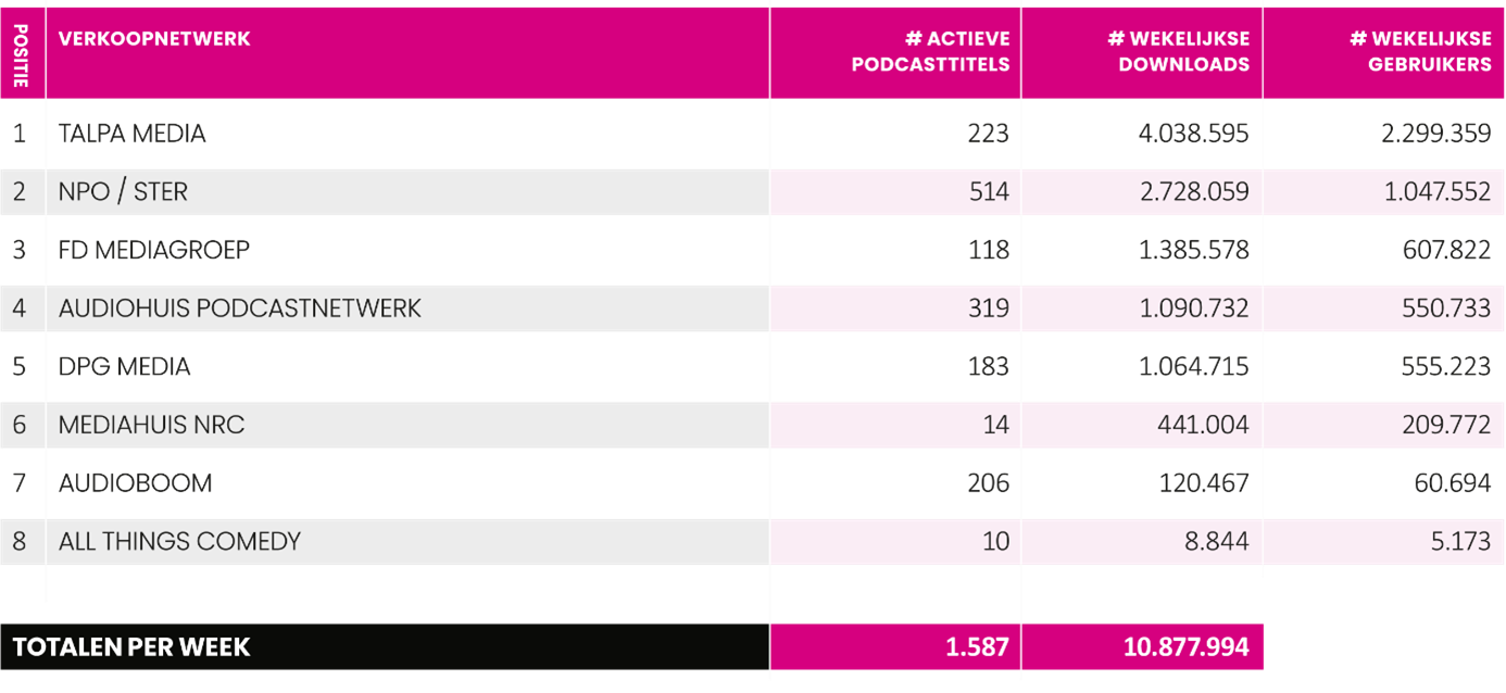 Volgens de meest recente cijfers van het Nationaal Media Onderzoek (NMO, juli 2025) is Talpa Media met 37% marktaandeel en 4,04 miljoen wekelijkse downloads de nummer één in de Nederlandse podcastadvertentiemarkt. Ook op het gebied van streaming audio voert Talpa Media de lijst aan, met 6,35 miljoen (gestarte) sessies per week.
