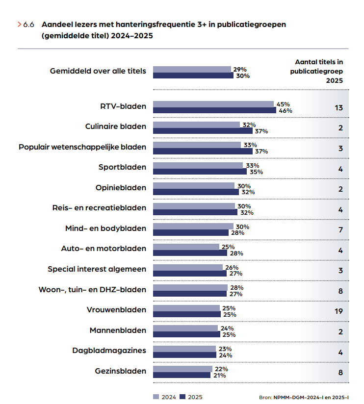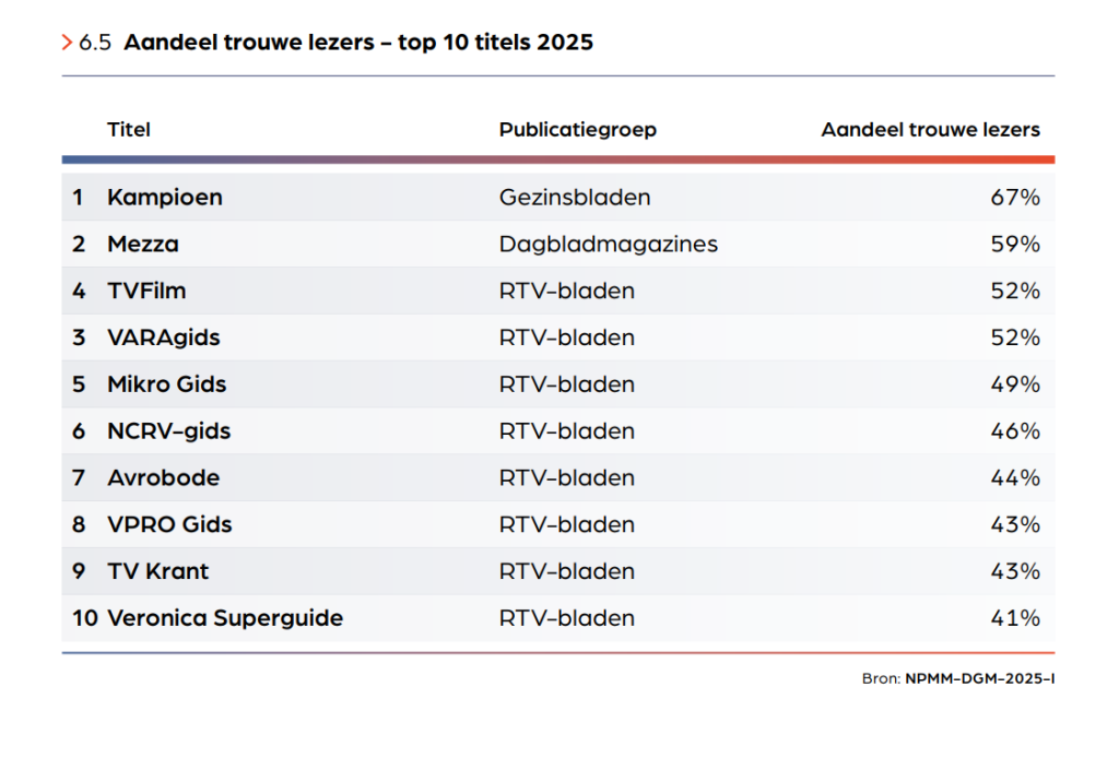 Hoewel het totale mediagebruik steeds meer richting online en on-demand verschuift, houden traditionele printtitels zoals televisiegidsen stevig stand. Volgens het onderzoek leest nog altijd een groot deel van de Nederlanders magazines op papier, en binnen die categorie behoren juist de TV-gidsen tot de meest intensief en trouw gelezen titels. Uit het NMO-onderzoek blijkt dat met name televisiegidsen een hoge mate van lezersbinding kennen. Lezers pakken deze bladen vaker en herhaaldelijk op, wat zorgt voor een sterke betrokkenheid. Ook het aandeel ‘trouwe lezers’ ligt bij deze titels relatief hoog vergeleken met andere magazinecategorieën.