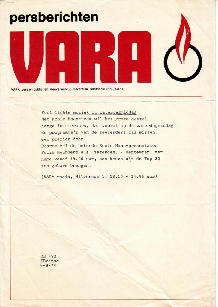 In het bericht kondigt de VARA aan op zaterdagmiddag “veel lichte muziek” te gaan draaien – een poging om de grote groep jonge luisteraars op te vangen die de zeezenders verloren zagen gaan. Het programma zou worden gepresenteerd door Felix Meurders, die een selectie uit de Top 30 zou laten horen.