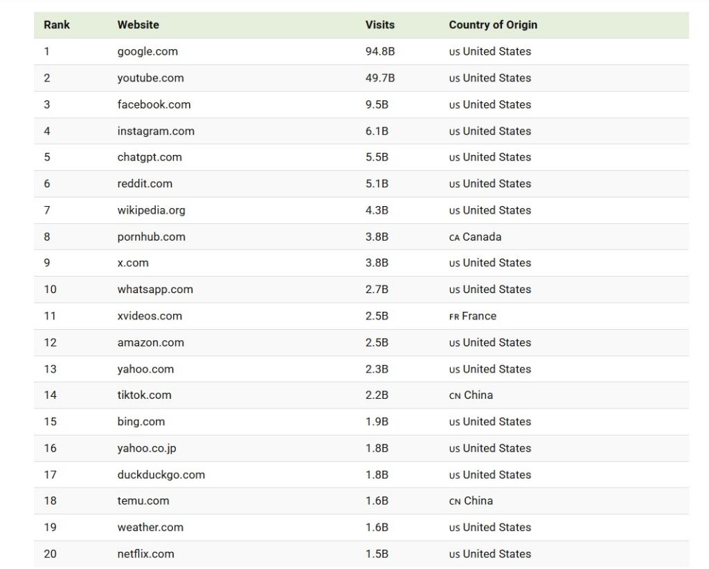 Netflix staat met 1,5 miljard bezoeken per maand op plaats 20. Dat lijkt relatief laag vergeleken met YouTube, maar Netflix is primair een abonnementsdienst waarbij veel gebruik via apps en smart-tv’s verloopt. De website fungeert vooral als toegangspoort.